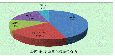 按完成单位分类,244项成果中由企业完成的107项、科研机构完成的54项、其中科研机构转制型企业完成的5项、大专院校完成的29项、医疗卫生机构完成的41项、其他单位完成的13项(见图4)。
