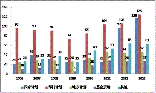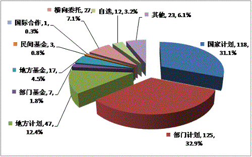 2013年登记的科技成果以部门计划为主,共计125项,占登记总数的32.9%,比2012年增加19项。国家计划科技成果118项(其中国家科技支撑计划34项,高技术研究发展计划6项,科技基础条件平台计划1项,重大科技专项1项,其他类国家计划76项),占登记总数的31.1%,比2012年增加21项。地方计划科技成果47项,占登记总数的12.4%,比2012年增加3项;基金资助科技成果(除国家基金以外的部门基金、地方基金和民间基金)27项,占登记总数的7.1%,比2012年增加1项;其他科技成果(包括国际合作、横向委托和自选等)63项,占登记总数的16.6%,比2012年减少1项(见图1-1、1-2)。