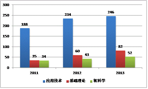 2013年登记科技成果按照成果类别划分可分为应用技术类、软科学类和基础理论类三种,其中,应用技术类科技成果246项,占登记总数的64.7%,比2012年增加12项;基础理论类科技成果82项,占登记总数的21.6%,比2012年增加22项;软科学类科技成果52项,占登记总数的13.7%,比2012年增加9项(见图1-3)。