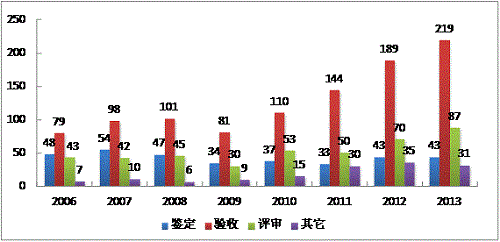 现阶段,我部科技成果评价方式以验收为主,评审为辅,鉴定逐步减少,其它评价方式总体增加。2013年,鉴定43项,验收219项,评审87项,其他31项。今后科技成果评价将更多地以市场检验为主,第三方评价等方式将逐步增多(见图1-4)。
