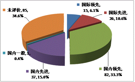 根据对2013年上报的应用技术成果的评价水平进行统计,其中达到国际领先水平的成果15项,占6.1%,达到国际先进水平的成果26项,占10.6%,达到国内领先水平的成果82项,占33.3%,达到国内先进水平的成果37项,占15%,未评价的成果85项,占34.6%(见图1-5)。