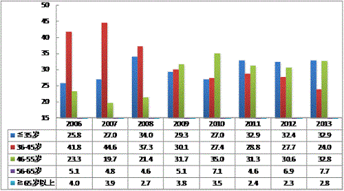 2006~2013年,≦55岁的人员中,≦35岁的人员比例略有增加,但相对稳定;36~45岁的人员呈减少态势,2013年为最少,只占到24%;46~55岁的人员增长显著,特别是近5年均突破了30%(见图1-6)。