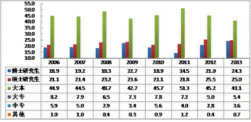 图1-7  2006~2013年科技成果完成人员学历结构(%)