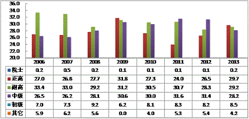 从职称构成看,主要集中在中级、副高和正高,2013年分别占到28.2%、29.2%和29.7%。2006~2013年,正高的比重呈波动状,2009年比重最高,达到31.8%;副高的比重总体呈现减少态势,2013年略有增加;中级人员比重总体呈增长趋势,已经从2006年的26.5%增加到2013年的28.2%(见图1-8)。