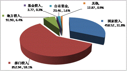 2013年登记的科技成果总经费投入为1443.46亿元,比2012年增加650.27亿元,经费投入以国家投入和部门投入为主(见图1-9)。其中,国家投入458.52亿元,占投入总额的31.8%,比2012年下降10.6个百分点;部门投入852.94亿元,占投入总额的59.1%,比2012年上升58.7个百分点;地方投入91.9亿元,占投入总额的6.4%,比2012年下降34.2个百分点;自有资金投入23.46亿元,占投入总额的1.6%,比2012年下降12.6个百分点;其他投入12.87亿元,占投入总额的0.9%,比2012年下降1.4个百分点;基金投入所占比重很小,2013年无国外资金和银行贷款投入。