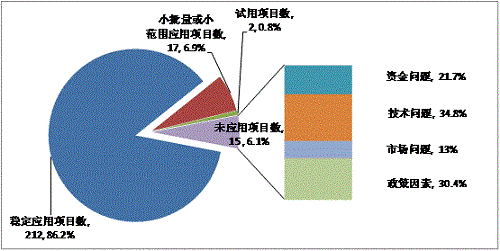登记的应用技术类科技成果中,稳定应用的科技成果保持着较高的比例,为212项,占86.2%;小批量或小范围应用项目为17项,占6.9%;试用项目为2项,占0.8%;未应用科技成果为15项,占6.1%(见图2-1)。从总体上看,成果未应用的主要原因是技术问题和政策因素,分别占34.8%和30.4%;其次是资金问题和市场问题,分别占21.7%和13%。
