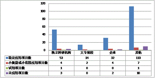 从稳定应用成果在各单位应用技术成果登记中所占比例来看,独立科研机构、大专院校、企业、其他单位分别为86.9%、87.5%、84.2%和86.3%,稳定应用成果比重均比较高。其次为小批量应用项目和试用项目,各单位分别为6.6%、12.5%、10.5%和5.3%(见图2-2)。