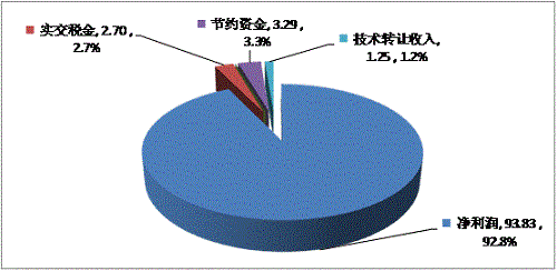 从成果获利形式上看,以净利润为主,共93.83亿元,占获利总额的92.8%;其次是节约资金3.29亿元,占获利总额的3.3%;实交税金2.7亿元,占获利总额的2.7%;技术转让收入1.25亿元,占获利总额的1.2%(见图2-3)。