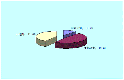 按成果来源分布。登记的省级科技成果中:国家计划项目成果90项,省部级地方计划项目成果416项,计划外成果351项。上述指标与上年相比,国家计划和计划外项目所占比例都有较大幅度上升,登记的省部级地方计划项目略有下降(见表2、图1)。