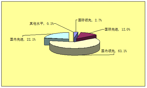 按成果水平分布。应用技术科技成果769项,达到国际领先水平的成果21项,占登记项数的2.7%,比上年增加9项,增长较为明显;达到国际先进水平的92项占12.0%,比上年略有下降;达到国内领先水平的485项占63.1%,同比上年增加43项;达到国内先进水平的170项占22.1%,较上年有所上升,国际领先、国内领先、国内先进水平项目数均高于上年,国际先进水平略低于上年(见表3、图2)。