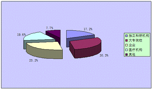 大专院校是科技成果主要完成单位。在2009年登记的成果857项中,成果完成单位按成果登记量排序依次是:大专院校260项,占登记成果数的30.3%、企业216项占25.2%、医疗机构168项占19.6%、独立科研机构147项占17.2%、其他66项占7.7%。目前,全省大专院校、企业及医疗机构科技成果数量较上年有所增加,独立科研机构和其他单位完成的科技成果较上年有所下降(见表4、图3)。