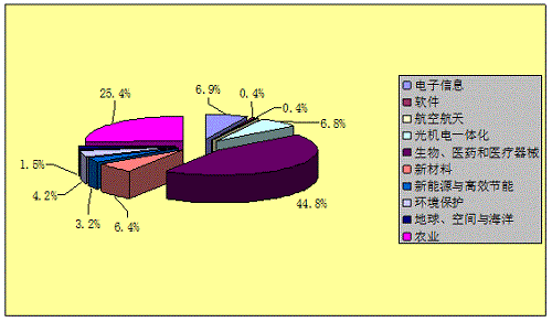 按所属高新技术领域分布。在769项应用技术成果中,有721项属于高新技术领域,占93.8%,较上年比较增加117项。其中电子信息领域50项,占高新技术领域的6.9%;软件领域3项,占0.4%;航空航天领域3项,占0.4%;光机电一体化领域49项,占6.8%;生物、医药和医疗器械领域323项,占44.8%;新材料领域46项,占6.4%;新能源与高效节能领域23项,占3.2%;环境保护领域30项,占4.2%;地球、空间与海洋领域11项,占1.5%;农业领域183项,占25.4%。在上述应用技术成果中,生物、医药和医疗器械领域的科技成果最多,所占比例较大,其次是农业领域的科技成果,有48项属于非高新技术领域(见图4)。
