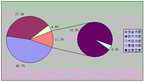 按应用情况分布。在769项应用成果中,已得到实际应用的成果574项,占74.6%;未应用成果数195项,占25.4%,较上年都有所上升。据统计,2009年登记的应用技术成果中,未应用的主要原因:资金问题91项,占未应用成果数的46.7%;技术问题73项,占 37.4%;市场问题9项,占4.6%;管理问题1项,占0.5%;政策因素21项,占10.8%(见表5、图6)。
