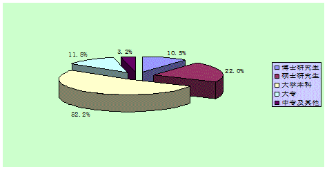 文化程度。2009年登记的科研成果完成人员中,大学本科学历以上占85%,成为各类成果的主要完成人员,其中,本科学历3721人(次),占总人数的52.2%;博士研究生748人(次),占10.5%;硕士研究生1570人(次),占22.0%;大专840人(次),占11.8%;中专及其他共计226人(次),占3.2%(见图7)。