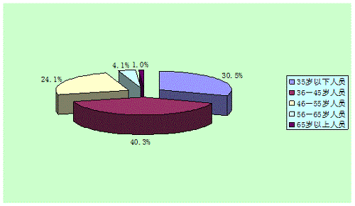 年龄结构。据对2009年全省登记的科技成果数据统计,中青年科技人员为成果完成主力军,70.8%完成人在45岁以下,全部成果完成人员中35岁以下(含35岁)的科研人员为2175人(次),占登记成果完成人总数的30.5%;36-45岁人员为2871人次,占总数的40.3%;46-55岁人员为1715人次,占24.1%;56-65岁人员为296人次,占4.1%;65岁以上人员为72人次,占1.0%(见图8)。
