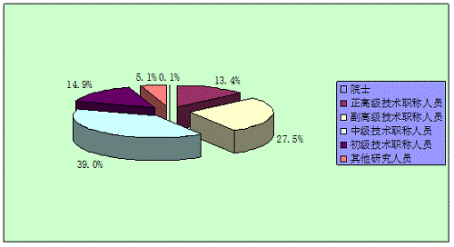 技术职称。2009年的登记成果完成人员中,副高级以上人员占完成人员总数的40.9%。其中:院士4人(次),占0.1%;正高级技术职称956人(次),占13.4%;副高级1959人(次),占27.5%;中级技术职称2782人次,占39.0%;初级技术职称的研究人员1062人次,占14.9%,其他研究人员366人,占5.1%(见图9)。