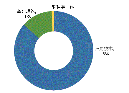 在2009年登记的科技成果中,应用技术成果583项,占86%;基础理论成果86项,占13%;软科学成果5项,占1%;应用技术成果占主流。