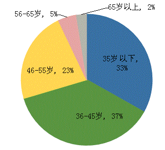 成果完成人员的年龄结构为:35岁以下(含35岁)有1799人,36-45岁有2022人,46-55岁有1221人,56-65岁有245人,65岁以上有139人。55岁以下研究人员占93%,中青年已成为科技一线的主力军。