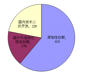 2009年江苏省科技成果中原始性创新项目有356项,占61%;国外引进消化吸收创新项目99项,占17%;国内技术二次开发项目128项,占22%。原始性创新项目占大多数。