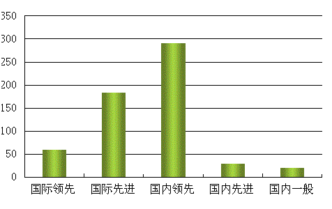 2009年江苏省科技成果水平状况,达国际领先项目有59项,占10%;达国际先进项目183项,占31%;达国内领先项目291项,占50%;达国内先进项目29项,占5%;达国内一般项目21项,占4%。其中,达国际先进与国内领先的项目占总数8成以上。