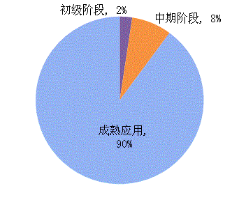 本年度统计的科技成果,处于初级阶段的成果有14项,中期阶段的成果有45项,成熟应用阶段的成果有524项,其中成熟应用阶段成果占90%。