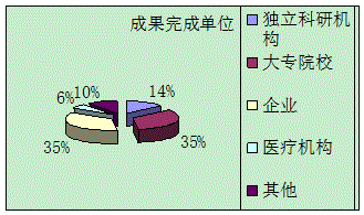 在214项科技成果中,独立科研机构完成29项约占13.5%左右,大专院校完成74项约占34.5%,企业完成77项约占35.9%,医疗机构完成12项约占5.8%,其他完成22约占10.3%。