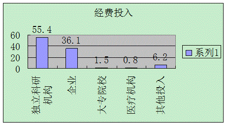 据统计,2009年登记成果的经费实际投入为11731253万元,独立科研机构投入为6509212万元占55.4%,,企业投入4232932万元占36.1%,大专院校投入175377万元占1.5%、医疗机构投入80408万元占0.8%、其他投入733324万元约占6.2%。