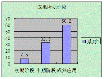 在186项应用技术成果中,处于初期阶段的成果14项约占7.5%,中期阶段的成果60约占32.3%,成熟应用阶段的成果112项约占60.2%。