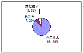 在671项科技成果中,基础理论成果39项,占成果总数的5.81%;应用技术成果583项,占成果总数的86.89%;软科学成果49项,占7.3%。