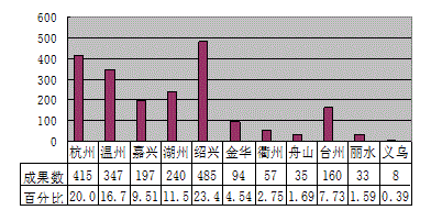 表3-2 浙江省2009年各地市科技局成果所处阶段构成(%)
