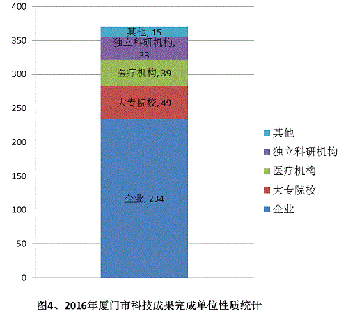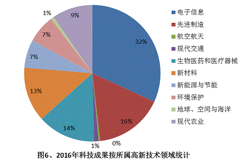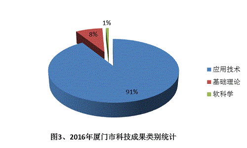2016年登记的科技成果类别分布与往年基本一致,应用技术类成果仍然高居登记成果的榜首,共337项,占登记成果总数370项的91.1%;基础理论成果数30项,占总数的8.1%;软科学成果数3项,占总数的0.8%(见图3)。基础理论和软科学成果的数量仍然占较低比例,这也是由于登记成果主要承担单位是应用性科技企业的原因。