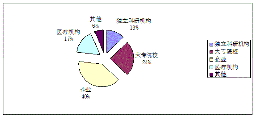 在登记的193项科技成果中,独立科研机构完成25项约占13%,大专院校完成47项约占24%,企业完成76项约占40%,医疗机构完成33项约占17%,其他完成12项约占6%。数据表明,企业完成成果数量位列第一。