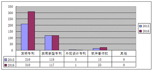 2016年知识产权数共计511项,其中发明专利310项,实用新型专利117项,外观设计专利1项,软件著作权23项,其他0项。已授权专利数共计329项,其中企业199项,独立科研机构9项,大专院校102项,医疗机构18项,其它1项。与去年数据对比分析,今年的知识产权数与去年相比有所提高。