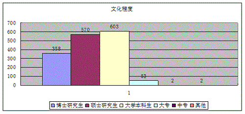 1、文化程度:按完成人员文化程度统计:博士研究生358人,硕士研究生570人,大学本科生603人,大专53人,中专2人,其他学历2人。上述数据显示,成果完成人员学历普遍较高。