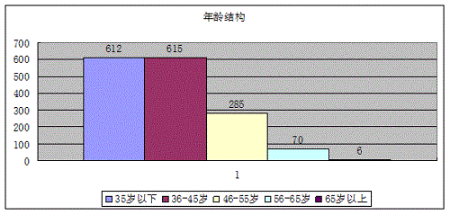 3、年龄结构:按科技成果完成人员年龄统计,35岁以下为612人,36-45岁为615人,46-55岁为285人,56-65岁为70人,65岁以上为6人。数据表明,中青年科技人员是科技成果创造的主体,而35岁以下的青年科技人员逐步成为科技创新的骨干力量。
