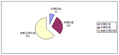 在登记的172项应用技术成果中,处于初期阶段的成果13项约占8%,中期阶段的成果50项约占29%,成熟应用阶段的成果109项约占63%,从统计数据看,大多数项目都已处在成熟应用阶段。