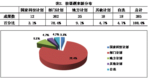 在385项登记成果中,来源于国家科技计划的项目成果占3.1%,部门计划项目成果占78.4%,地方计划项目成果占9.1%,其他计划项目成果占4.7%,自选项目成果占4.7%。鉴于公安部各类科研计划项目及由公安部组织申报的各类国家科研计划项目验收后的成果必须登记,其他成果自愿登记,故部门计划和国家计划项目成果占主要部分(见表2)。