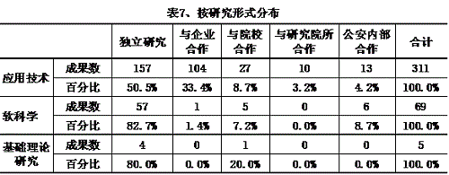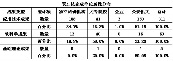 应用技术成果以公安机关为主要研究力量,在311项应用技术成果中,第一完成单位为公安机关的成果159项,占51.1%。软科学成果以大专院校为主要研究力量,在69项软科学成果中,第一完成单位为大专院校的成果40项,占58.0%;基础理论研究成果仅有5项(见表3)。