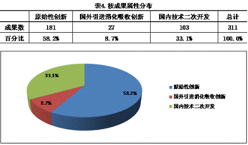 在311项应用技术成果中,“原始性创新”成果占成果总数的58.2%,“国外引进消化吸收创新”成果占8.7%,“国内二次开发”占33.1%(见表4)。