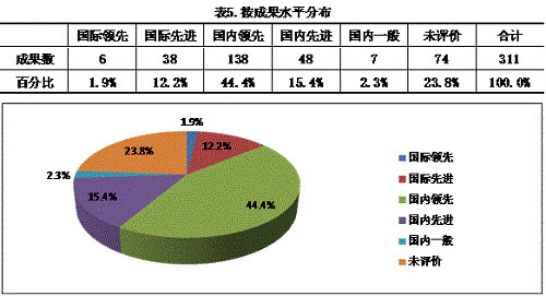 在311项应用技术成果中,“国际领先”占1.9%,“国际先进”占12.2%,“国内领先”占44.4%,“国内先进”占15.4%,“未评价”占23.8%(见表5)。
