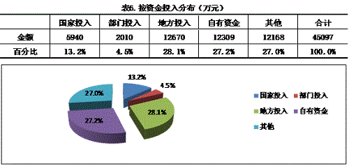 2016年度登记成果的经费实际投入额总计45097万元。其中,国家投入5940万元,占13.2%;部门投入2010万元,占4.5%;地方投入12670万元,占28.1%;自有资金12309万元,占27.2%;其他投入12168万元,占27.0%(见表6)。