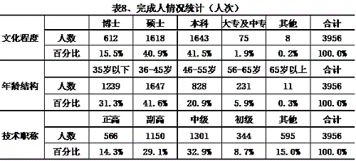 登记成果共涉及完成人3956人,按文化程度、年龄结构和技术职称分布情况(见表8)。