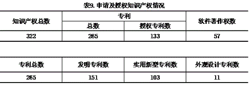 在311项应用技术类成果中,申请知识产权及获得知识产权数量共322项,其中,专利265项,软件著作权57项。在265项专利中,授权专利133项(见表9)。