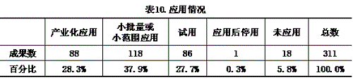 在311项应用技术类成果中,产业化应用成果88项,占成果总数的28.3%;小批量或小范围应用成果118项,占37.9%;试用成果86项,占27.7%;停用和未应用成果19项,占6.1%(见表10)。