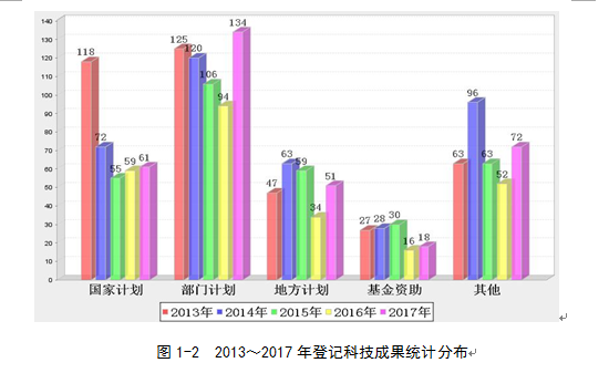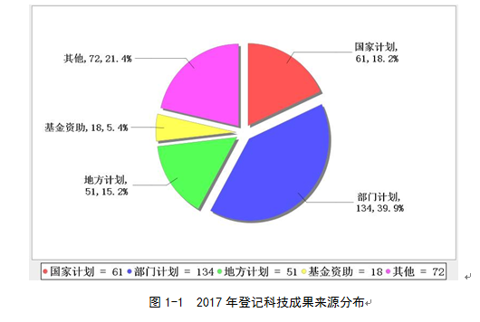 2017年登记的科技成果以部门计划为主,共计134项,占登记总数的39.9%,比2016年增加40项。国家科技计划61项(其中,自然科学基金12项,科技支撑计划9项,科技基础性工作专项5项,高技术研究发展计划3项,科技重大专项2项,重点基础研究发展计划2项,国家软科学研究计划2项,火炬计划1项,其他25项)占登记总数的18.2%,比2016年增加2项。地方计划51项,占登记总数的15.2%,比2016年增加17项。基金资助科技成果(除国家基金以外的部门基金、地方基金、)18项,占登记总数的5.4%,比2016年增加2项。其他科技成果(包括国际合作、横向委托和自选等)72项,占登记总数的21.4%,比2016年增加20项。(见图1-1、1-2)