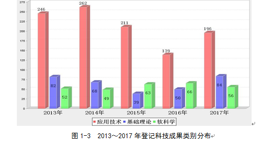 2017年登记科技成果按照成果类别划分可分为应用技术类、软科学类和基础理论类三种,其中,应用技术成果196项,占登记总数的58.3%,比2016年增加57项。基础理论成果84项,占登记总数的25.0%,比2016年增加34项。软科学成果56项,占登记总数的16.7%,比2016年减少10项。(见图1-3)