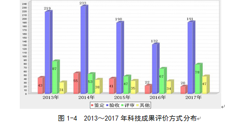 2017年登记的科技成果中,评价方式主要以验收项目为主,共191项,评审项目数78项,鉴定项目数20项,其他评价方式47项。今后,科技成果评价将更多地通过市场来检验,第三方评价等方式将逐步增多(见图1-4)