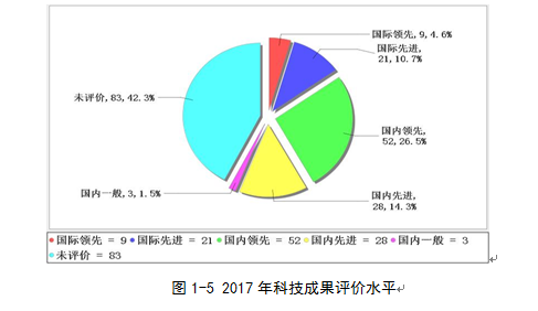 2017年登记的196项应用技术类成果中,水平达到国际领先的成果9项,占4.6%;达到国际先进的成果21项,占10.7%;达到国内领先的成果52项,占26.5%;达到国内先进的成果28项,占14.3%;达到水平一般的成果3项,占1.5%;未评价的成果83项,占42.3%。(见图1-5)