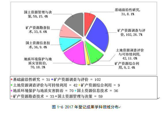 2017年登记的成果按照成果学科领域划分,分为基础前沿性研究成果31项,占登记成果总数的8.1%;矿产资源调查与评价成果102项,占登记成果总数的26.7%;土地资源调查评价与可持续利用42项,占登记成果总数的11.0%;矿产资源综合利用9项,占登记成果总数的2.4%;地质环境保护与地质灾害防治70项,占登记成果总数的18.3%;国土资源信息技术36项,占登记成果总数的9.4%;矿产资源勘查技术33项,占登记成果总数的8.6%;国土资源管理与决策59项,占登记成果总数的15.4%。(见图1-6)