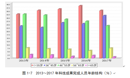 2017年,从科技成果完成人员的年龄结构看,主要集中在以下年龄段:35岁以下(含35岁),占比35.5%;36~45岁,占比31.7%;46~55岁,占比24.2%。 (见图1-7)。